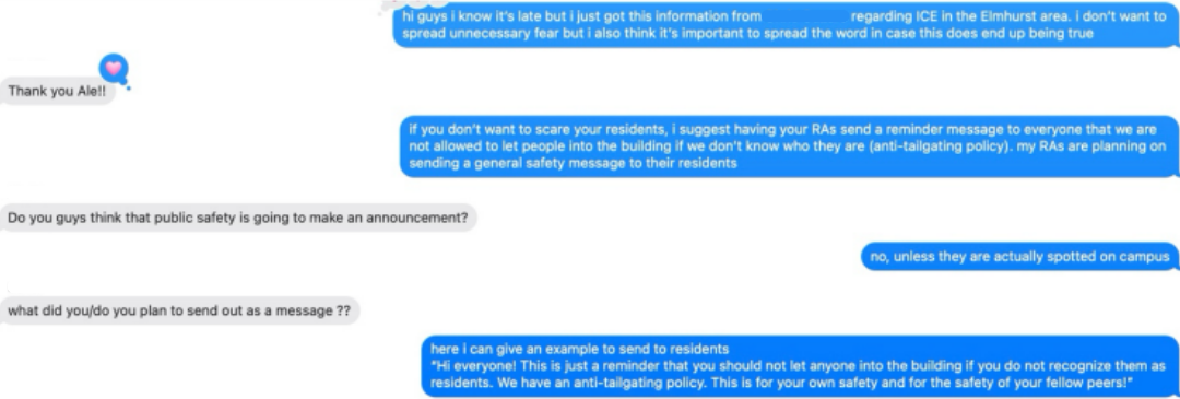 Given the uncertainty of the situation, her actions were reasonable. There was no confirmed ICE activity, and the anonymous student claimed they had already notified the proper authorities. She never suggested the idea, instead, recognized the benefits of that approach. Without the benefit of hindsight, her actions make sense in the context of avoiding fearmongering and protecting students across campus residences.