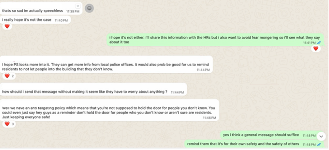At 11:42 p.m., Galvan shared the information she received with other HRs. Around the same time, another RA in Niebuhr Hall suggested highlighting the anti-tailgating policy.