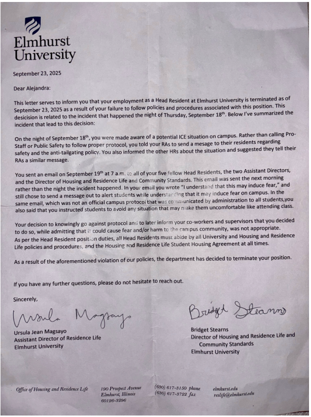 Elmhurst, like all private universities, holds the authority to make unopposed decisions that affect its student staff. Sometimes, those decisions touch on questions of free expression, especially in a tense political climate. On September 23, Alejandra Galvan, ’26, faced that tension head-on and she was removed from her position as a head resident by their Office of Residential Life, in a censorship-like fashion.