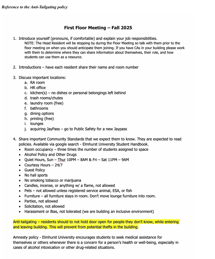 Galvan followed that and suggested the other HR’s have their RAs send messages to their residents reiterating Elmhurst University’s anti-tailgating policy referencing a prior event.