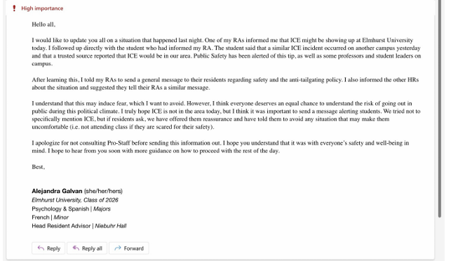 On the night of Sept. 18, around 11 p.m., a student (who wished to remain anonymous) reported to Niebuhr Hall RA and SGA Vice-President Avaion Viverette that ICE would be on campus the next day. Galvan also confirmed with the student and received the same information. The student also claimed to have shared this with multiple RAs, Elmhurst University’s Office of Public Safety, the Student Government Association, Professor Beatriz Gomez-Acuna, and other offices.