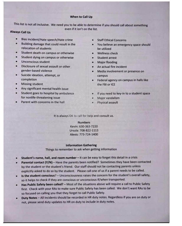 Galvan messaged her team of RAs and HRs to remind residents of the school’s anti-tailgating policies following a reported Immigration and Customs Enforcement concern on campus on Sept. 18. She had been a stellar RA and HR, praised by students and staff for her dedication over two-and-a-half years. However, her termination still came despite everyone else praising her. She was not given an opportunity to appeal.